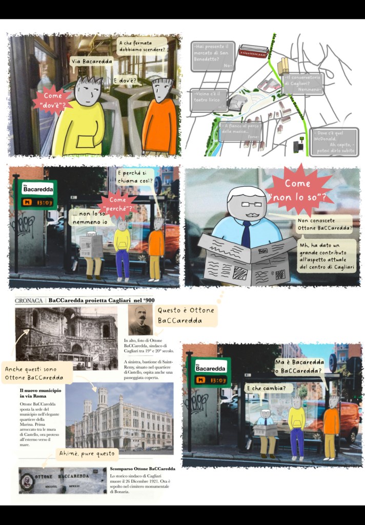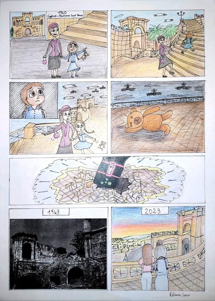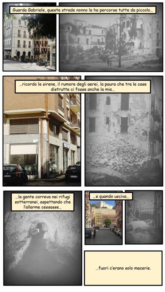 Each experience of place is shaped by what we and others have lived there, almost as whispers below the surface. Eliana’s carefully-portrayed encounter of past and present, wordlessly colliding in place, is a powerful reminder not only of the events that took place in Cagliari during the Second World War. The conflict continues to shape the urban fabric, not only through impacts of bombs that are still visible in the old city, but also of how such events shape contemporary human lives and memories.