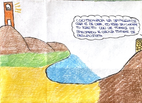 Our mosaic kept growing, as students shared their visions and experience of their lives in the island of Sardinia. For these first-year students, being asked to draw geographical imaginaries did not come easily. Others embraced the exercise, and showed why their lives were filled with unique sense of place. Others drew people and places beyond their island, telling tales of travel and exploration, as thought their own home wasn’t worth narrating. I share here those who drew places special to them, in Sardinia, and who accepted to share these here.